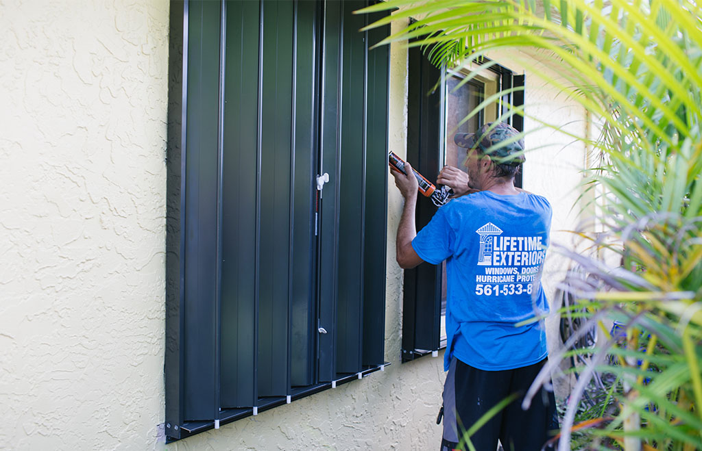 Light weight for ease of installation. Meeting the requirements for hurricane protection. A cost-effective means of storm protection made of .050” light weight corrugated aluminum. These panels overlay one another as wide as needed with a maximum height of 12’6” in some cases. The most commonly used storm panel installation is vertical mount, in which you need a recessed opening with a flat area around the window or door, with no obstacles. The second kind of storm panel installation is horizontal. This method is preferred when there is a sill protruding on the bottom of the window or doorways.